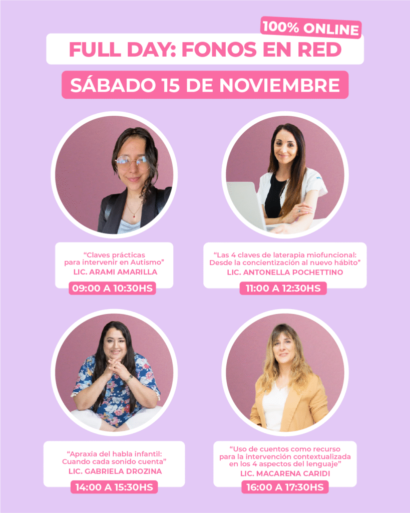 El FULL DAY: FONOS EN RED está dirigido a estudiantes y profesionales que buscan enriquecer su práctica diaria con contenidos actualizados, dinámicos y de gran impacto clínico.